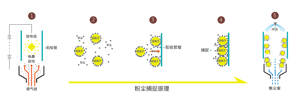 在電場力的作用下,整個沉澱極管內部都形成電暈區,在電暈區內,高濃度的負離子(電子)從電暈電極源源不斷地向沉澱極管做定向運動從而形成電暈電流。當含有水霧、粉塵及其他汙染物的煙氣進入沉澱極管時,由於離子的碰撞和擴散,水霧、粉塵和汙染物荷電,然後在電場力的作用下迅速抵達沉澱極管的內壁並同時釋放出電荷,在沉澱極管內壁形成液膜,液膜、粉塵和汙染物在重力作用下流到靜電除霧器下部的集液槽中集中處理,從而達到捕集煙氣中霧滴、粉塵和其它汙染物的目的。